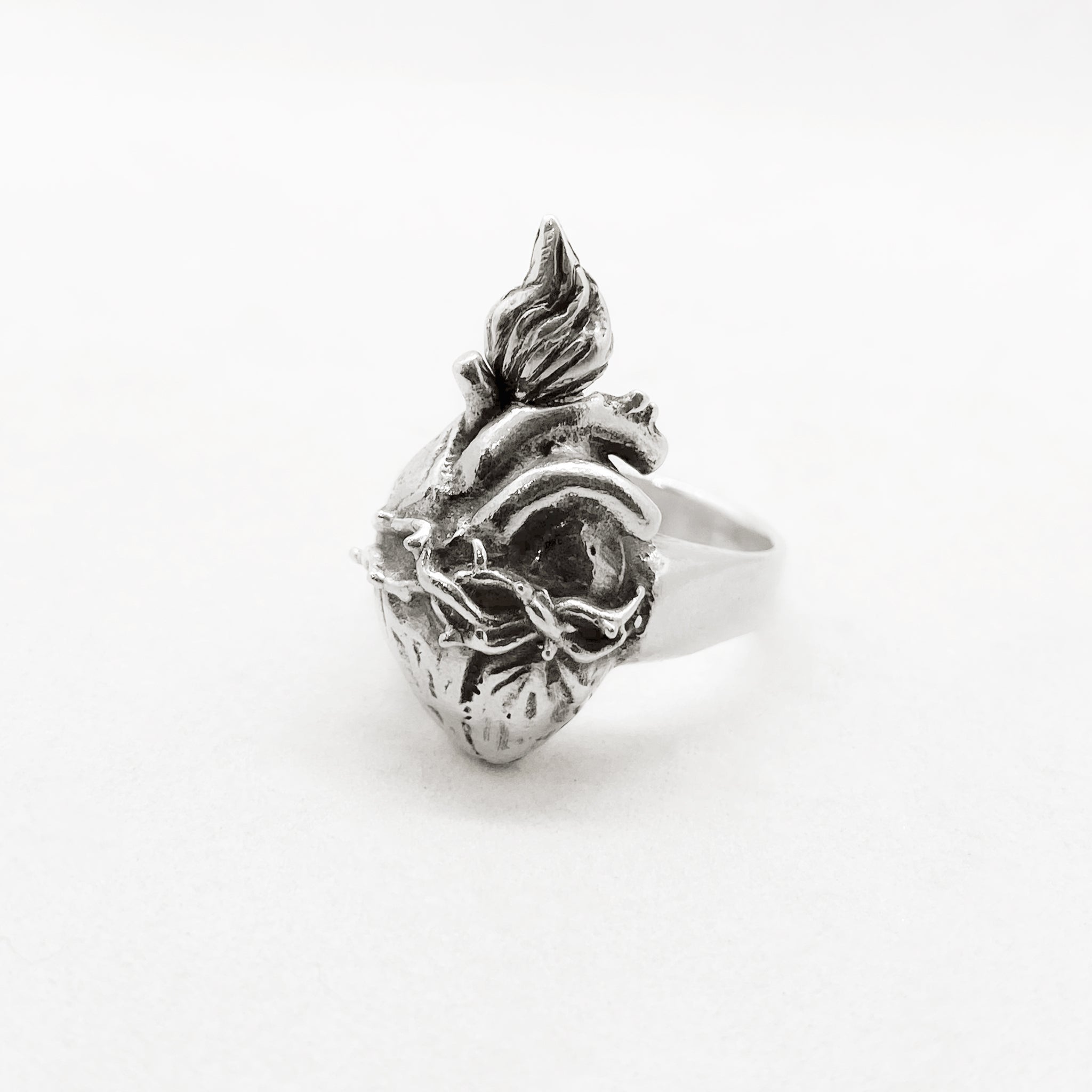 Anillo corazón anatómico, protegido por espinas y custodiado por una llama que puede ser extraída. Bajo su superficie un espacio oculto donde guardar lo que no debe ser mostrado: un secreto, una memoria, una escencia. Acabado envejecido en los bordes y brillante efecto espejo.