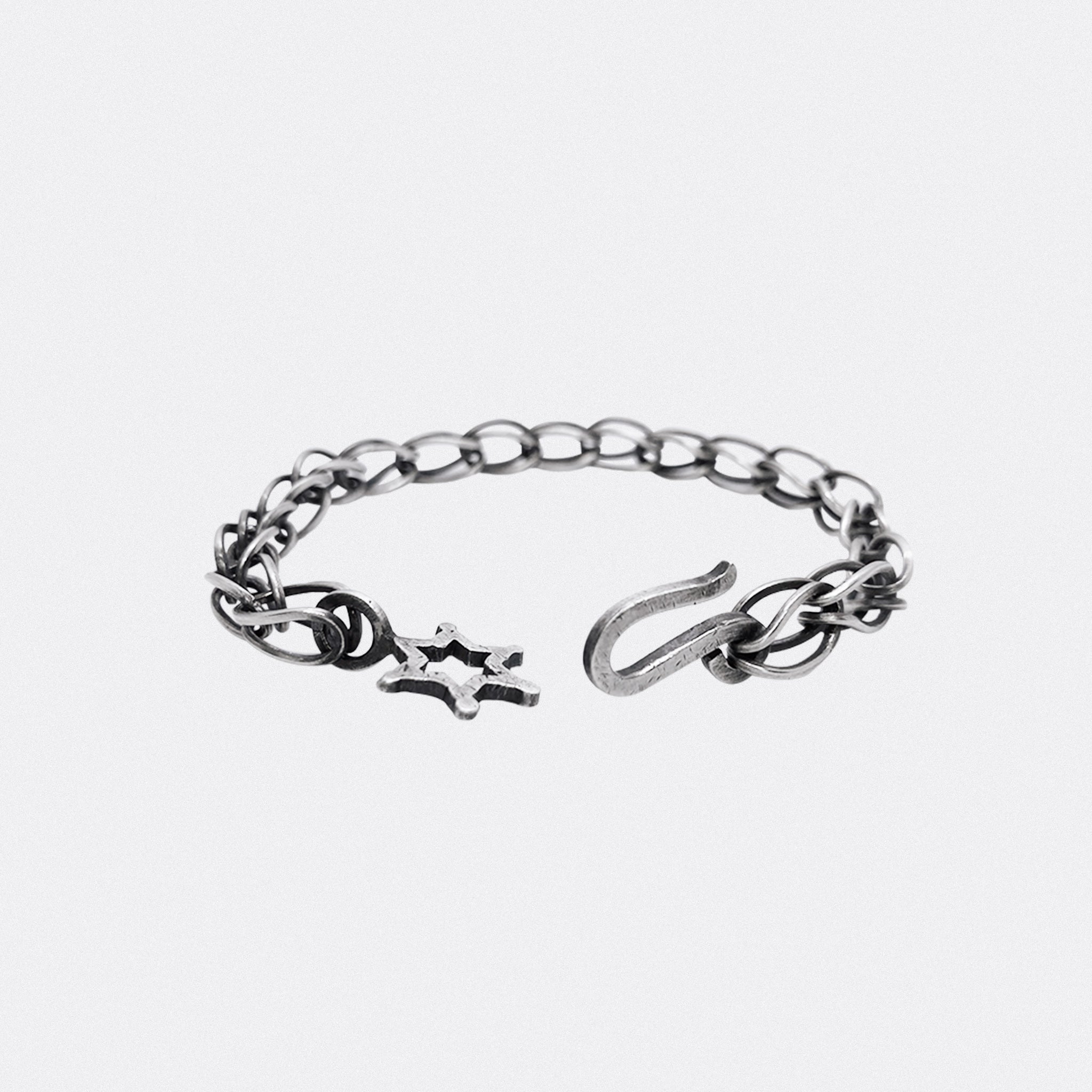 Brazalete de plata con ensambles de ovales, con dije en forma de estrella Sheriff que funciona como ajuste para el broche, acabado desgastados.