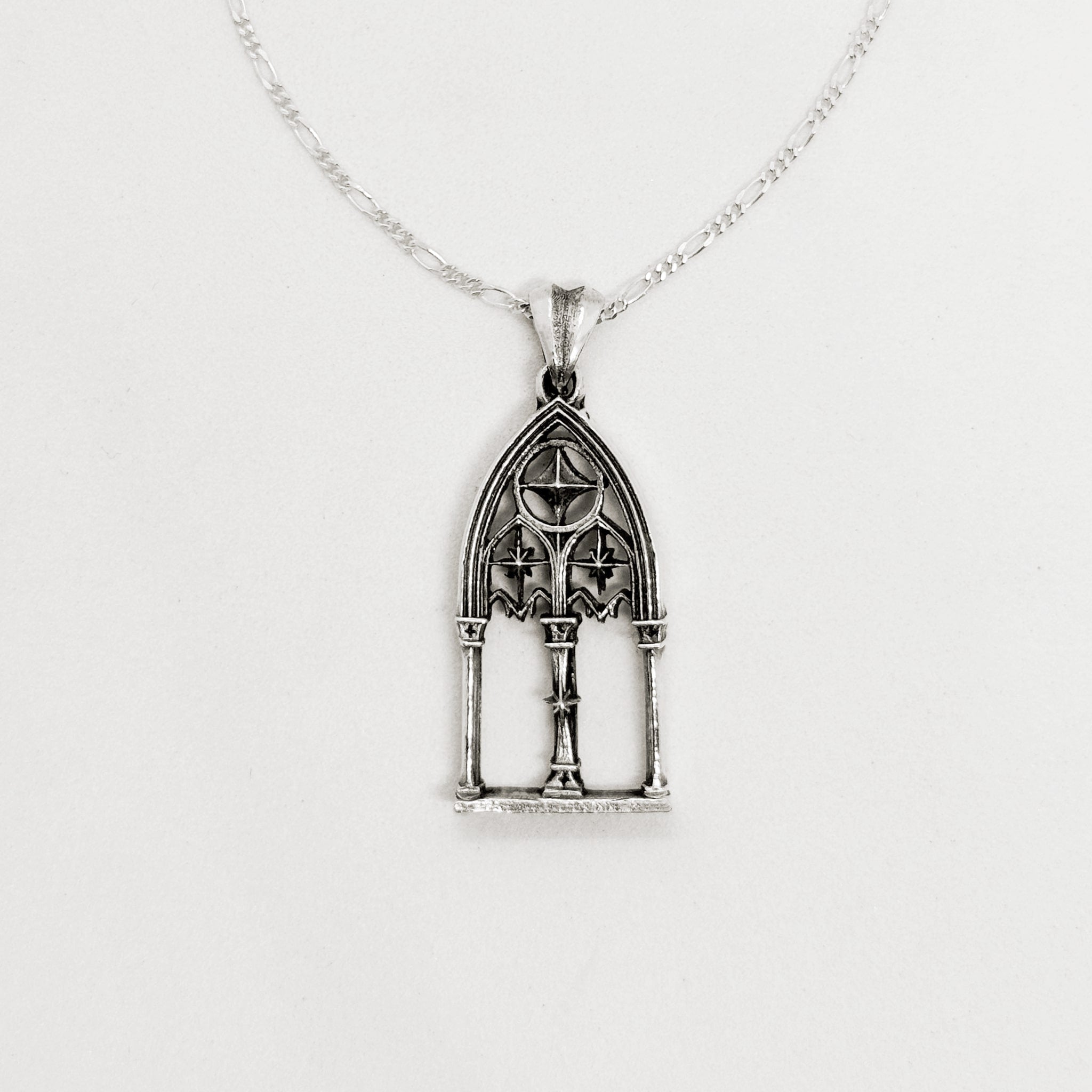 Dije de 3 cm, acabado envejecido brillante efecto espejo. acompañado con cadena delgada de estilo figaro.